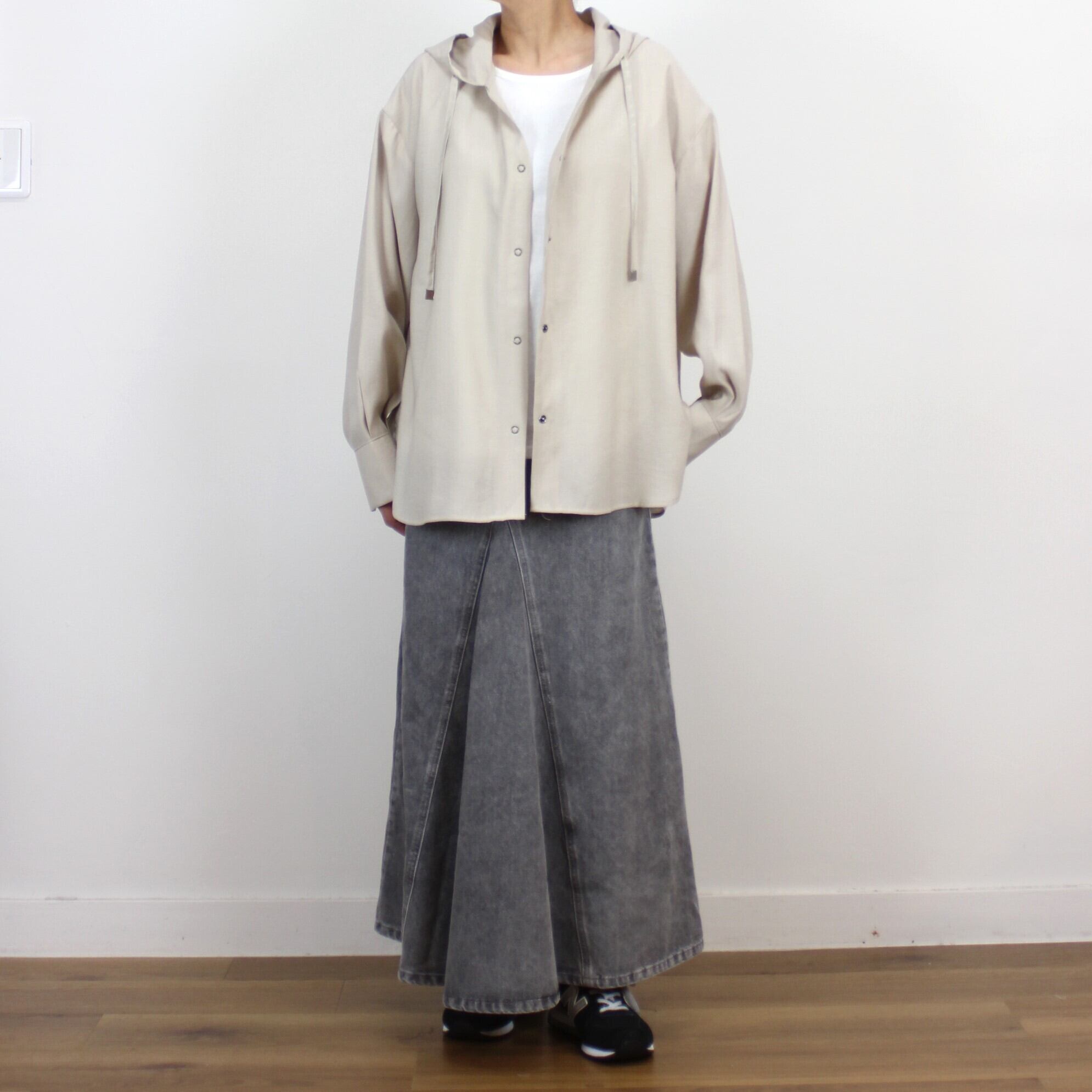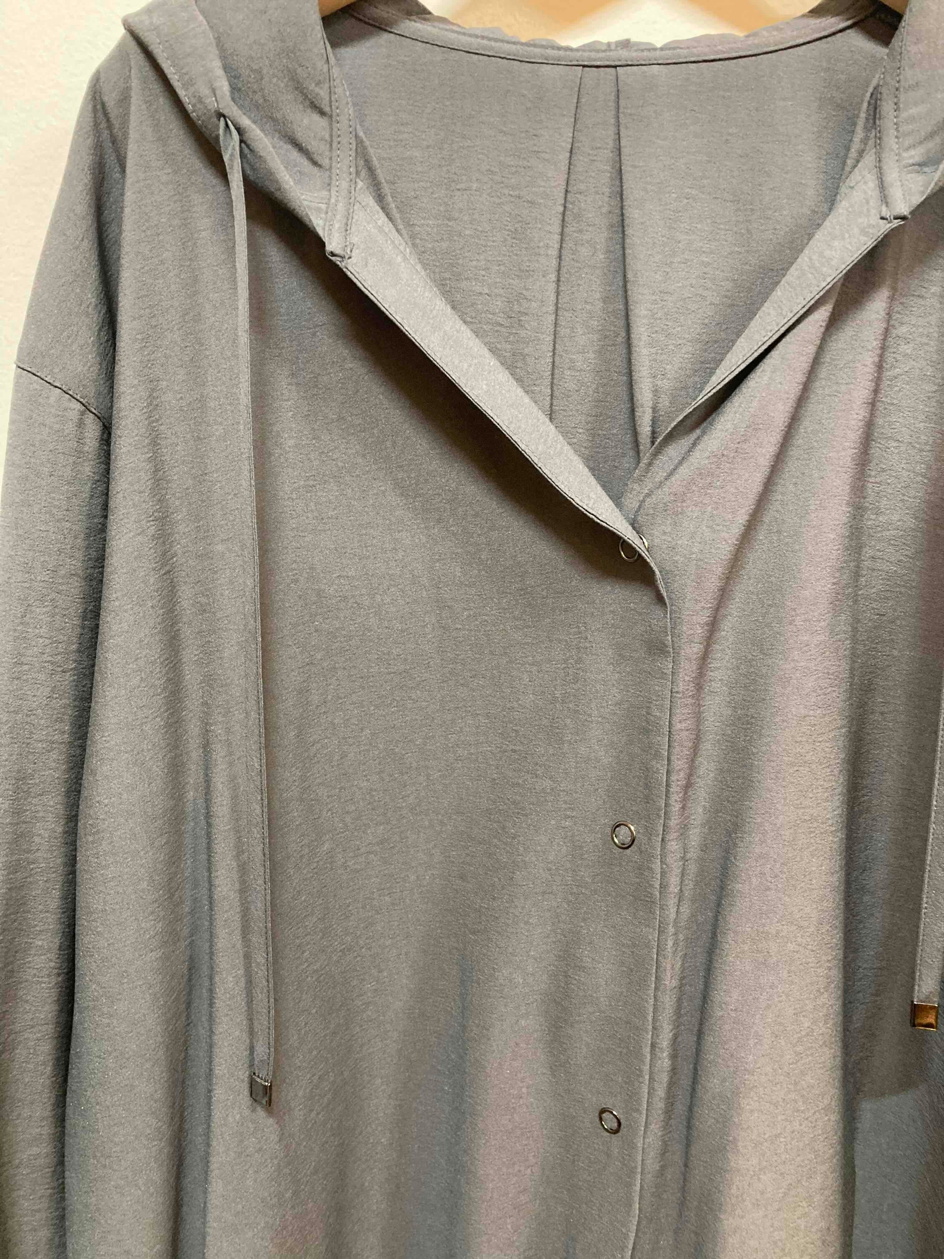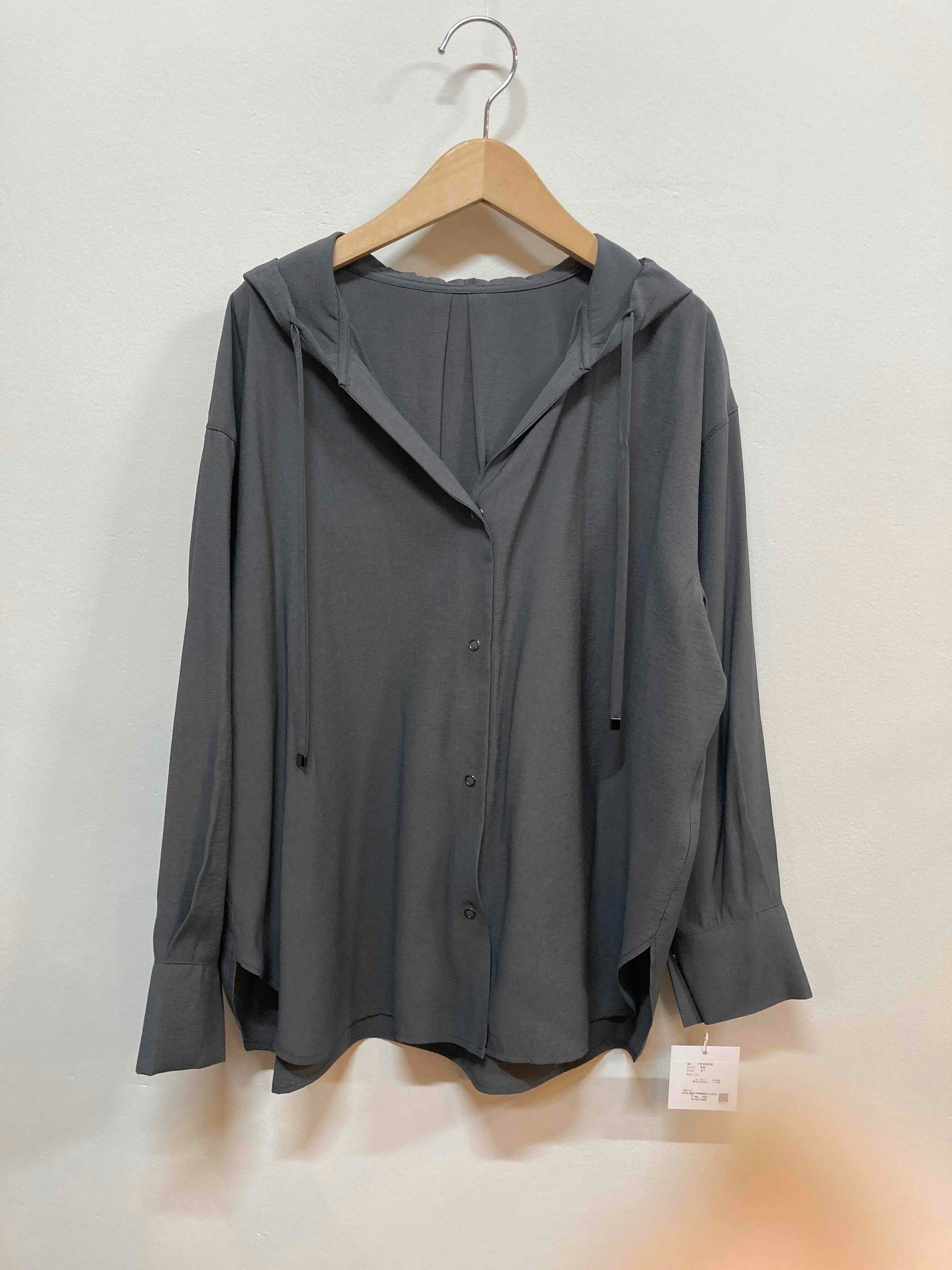 フードが付いていることで、首周りにアクセントを加えつつ、さらっとした雰囲気を演出します。デニムやスカートなど、幅広いボトムスとのコーディネートが楽しめるため、様々なシーンで活躍すること間違いなしです。このブラウスで、自分だけのスタイルを楽しんでみてはいかがでしょうか!