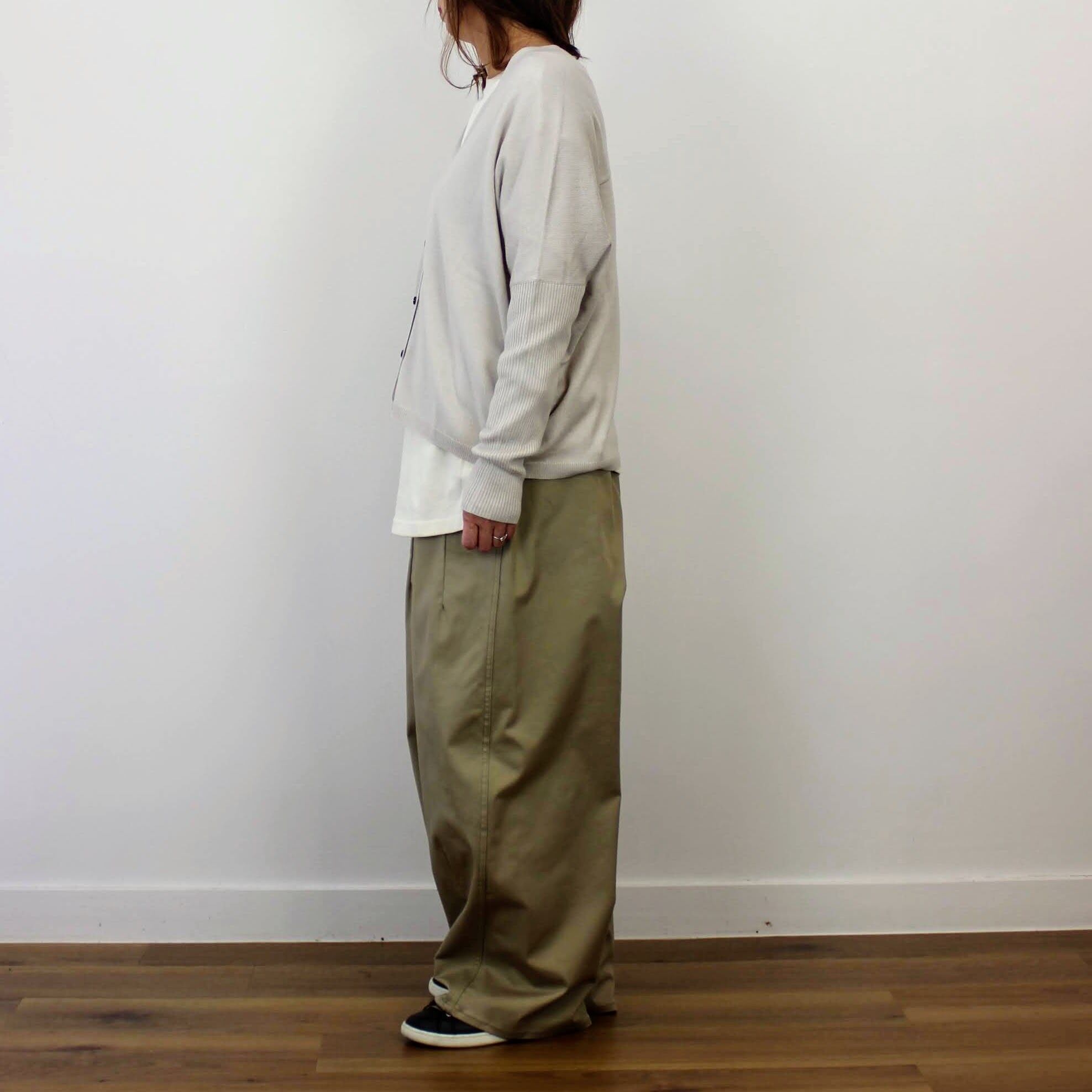 履き心地とシルエットに感動すること間違いなしのチノストレッチコクーンワイドパンツ。腰回りはゆったりとしたコクーンシルエットで、脚はすっきりと見えるワイドパンツデザインです。程よいストレッチ素材を使用しているため、動きやすさと快適さも兼ね備えています。